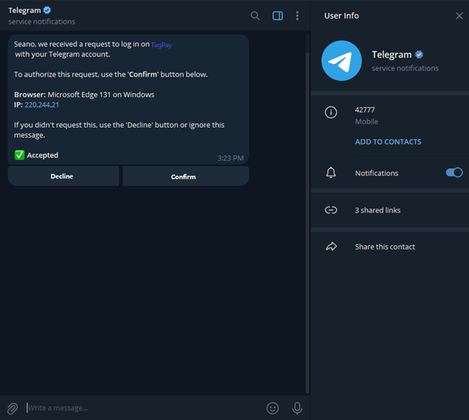 Finally, click the "Accept" button to allow TagPay to link to your Telegram account.